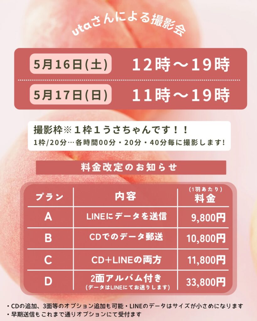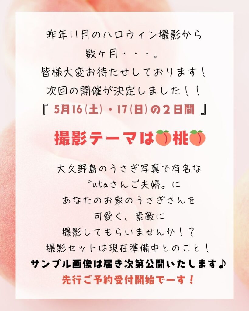 うさぎ写真家utaさん、次回のテーマは…⁉ 2026.03.13 皆様お待たせいたしました!うさぎ写真家utaさんによるうさわたでの撮影会のご予約受付が今日からスタート!テーマは『🍑桃🍑』お写真サンプルは届き次第公開いたします📷開催日は5月16(土)・17日(日)の2日間ですお家のうさぎさんを可愛く撮影してもらいましょう☺️お楽しみに😊TEL075ー682-2380 一覧に戻る