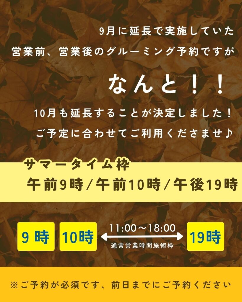グルーミングサマータイムさらに、さらに⁉延長決定👏 2025.10.01 夏の暑さ対策として営業前と営業後にご利用いただける【グルーミングサマータイム】を8月、9月と行ってきました😊多くのご好評のお声をいただき、10月もこのシステムを継続することに決定いたしました👏✨こちらをご利用の場合はご予約が必須です💦必ず前日までにご予約くださいませ!☎075-682-2380 一覧に戻る