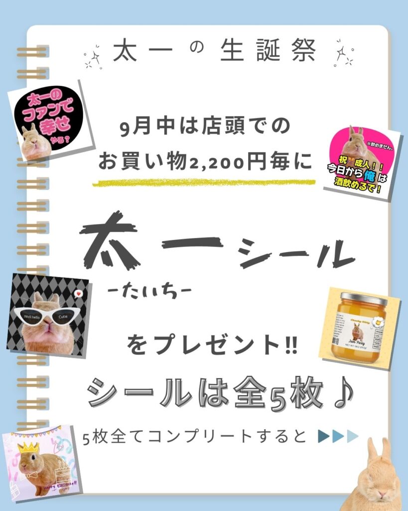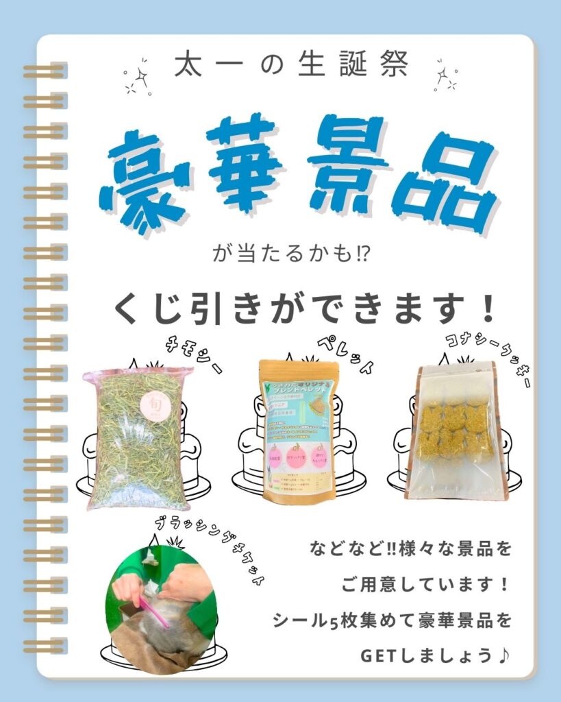 祝🎊太一1歳生誕祭🐰👑 2025.08.30 🎂パワフルやんちゃ2代目看板うさぎ太一は9月がお誕生日🎂9/25で太一は1歳になります♪来月で1歳、人間でいう成人になるんです😳あの太一が、成人に‼️笑いつも太一を可愛いがっていただいている皆様に感謝の気持ちを込めて✨🩷9月は太一生誕祭を開催します♪うさわたでお買い物をして豪華景品をGETしちゃいましょう😆太一に会いにうさわたへ遊びに来てくださいね☺️ 一覧に戻る